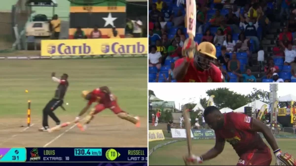 Russell mishit one from right-arm seamer Jeremiah Louis to the Patriots skipper Evin Lewis at extra cover and set off for a single. Lewis collected the ball on the bounce and fired a direct hit to the non-striker’s end to have Russell well short. The batter, having struck three sixes in a 13-ball 22, was furious at the dismissal, which occurred at just about the halfway stage of the innings. He made his emotions known while walking back till the point he headed into the dugout.