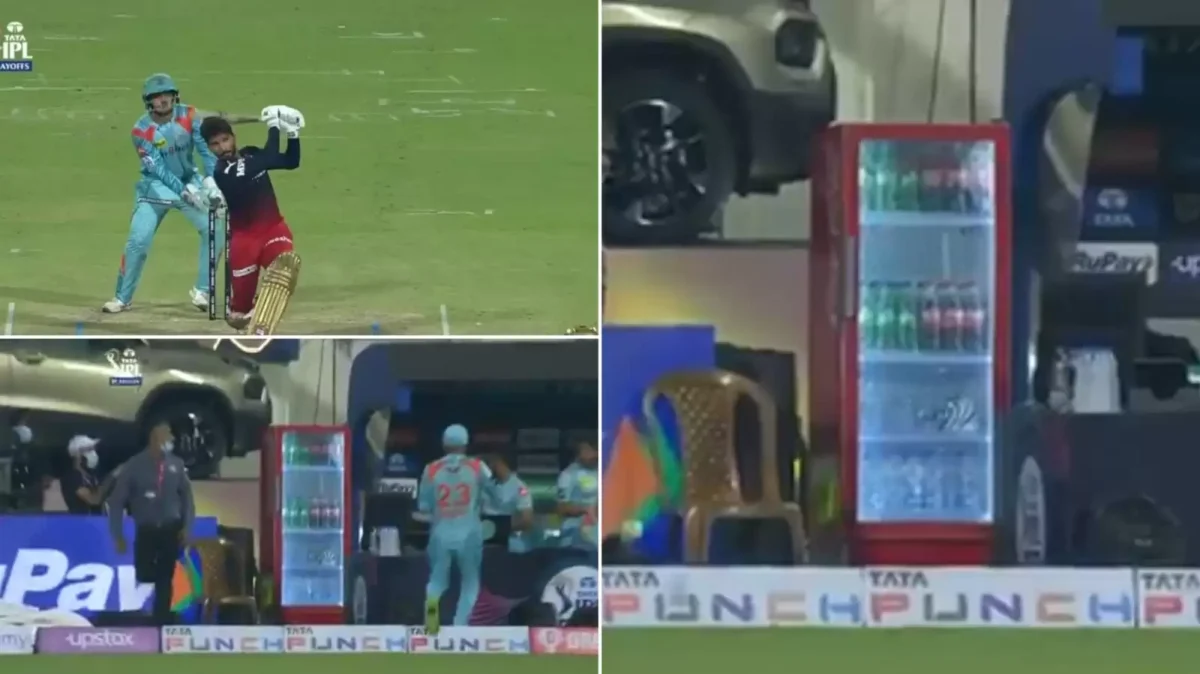 A six from Rajat Patidar off Ravi Bishnoi during the IPL 2022 Eliminator clash on Wednesday was seen hitting the fridge glass door adjacent to the LSG dugout, dismantling the object.