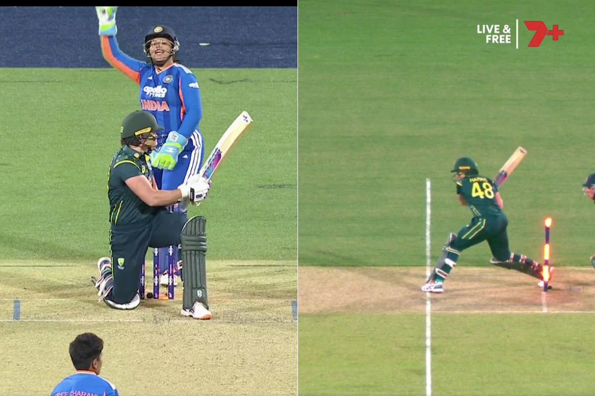 The incident happened on the first ball of the 17th over of Australia’s chase. Grace stood deep inside the crease and managed to pull the delivery from Shree Charani for a four but ended up dislodging the bails as she stepped on the stumps.
